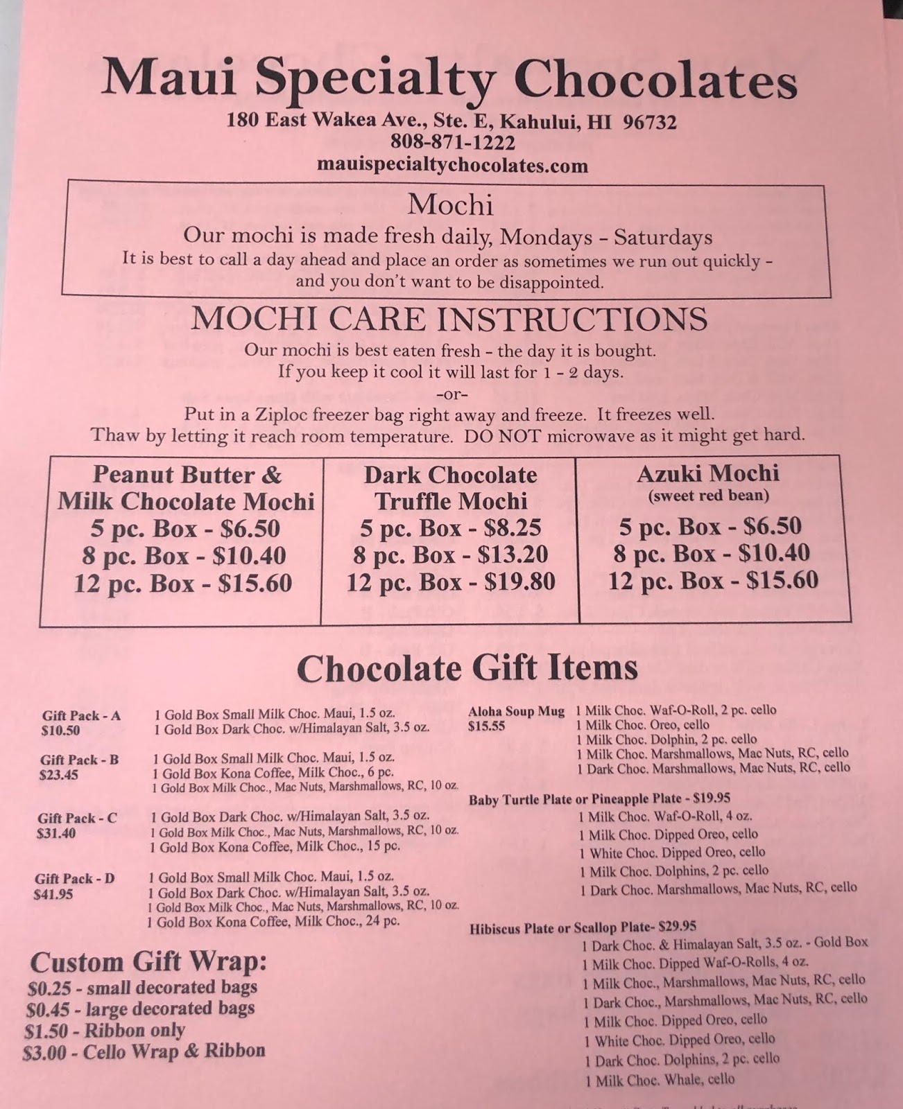 Menu at Maui Specialty Chocolates, Kahului, 180 Wakea Specialty Chocolates Maui 1,936 likes · 16 talking about this · 638 were here. Mochi filled with chunky peanut butter and our rich milk chocolate. Maui specialty chocolates was formed in 1990 and is known for its. peanut butter & milk chocolate mochi, made fresh daily. peanut butter & milk chocolate mochi. 180 e wakea ave, suite e, kahului, hi, 96732,. Specialty Chocolates Maui.